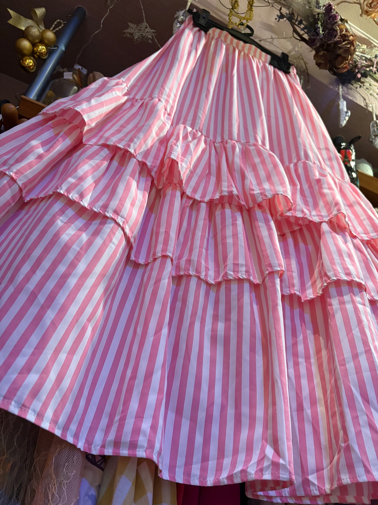 大人可愛い魅力がたっぷり詰まったストライプフリルティアードスカートです。マキシ丈のデザインが、エレガンスさと女性らしさを引き立て、フリルのティアードがリズミカルな動きを加えます。ストライプ模様がスタイリッシュで、カジュアルにも着こなせる万能アイテムです!