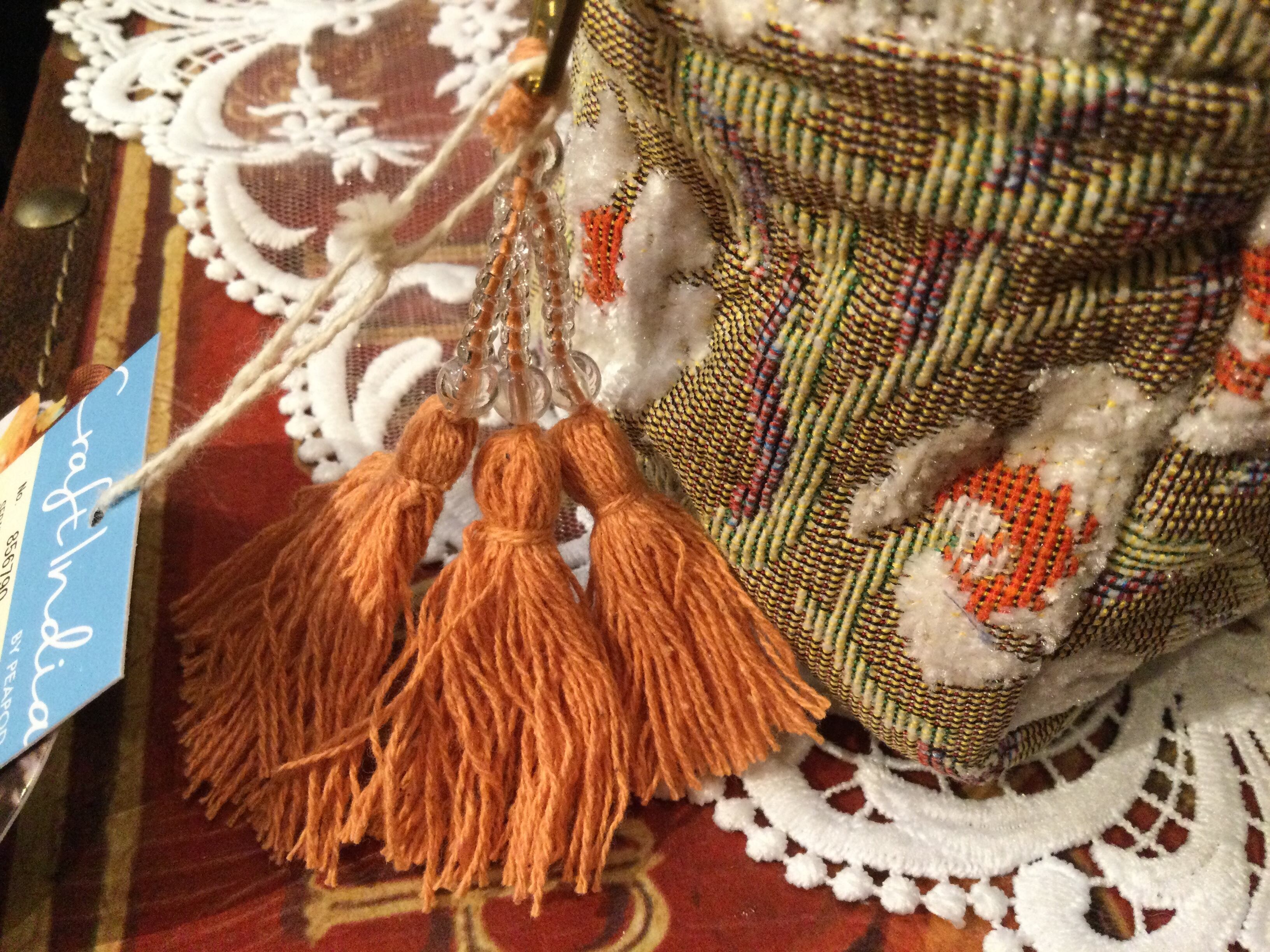 インドで複雑な織りの技術を使って表現された魅力的な生地で作りました。小さなバッグにも入れやすいミニサイズなので、メイク直しのコスメなどの小物をまとめるときに重宝します。持ち手のタッセルがポイント。